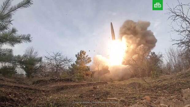 Минобороны России опубликовало кадры удара ракетного комплекса «Искандер» по ангарам с военной техникой и боеприпасами ВСУ.
